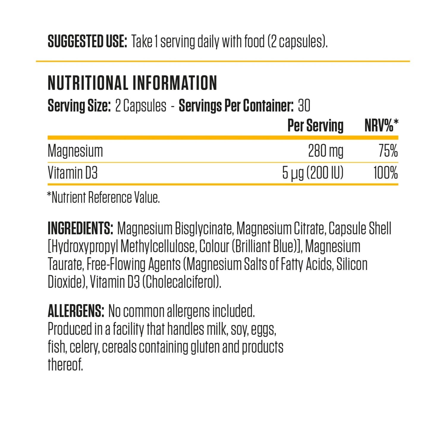 Magnesium Bisglycinate, Magnesium Citrate, Capsule Shell [Hydroxypropyl Methylcellulose, Colour (Brilliant Blue)], Magnesium Taurate, Free-Flowing Agents (Magnesium Salts of Fatty Acids, Silicon Dioxide), Vitamin D3 (Cholecalciferol).