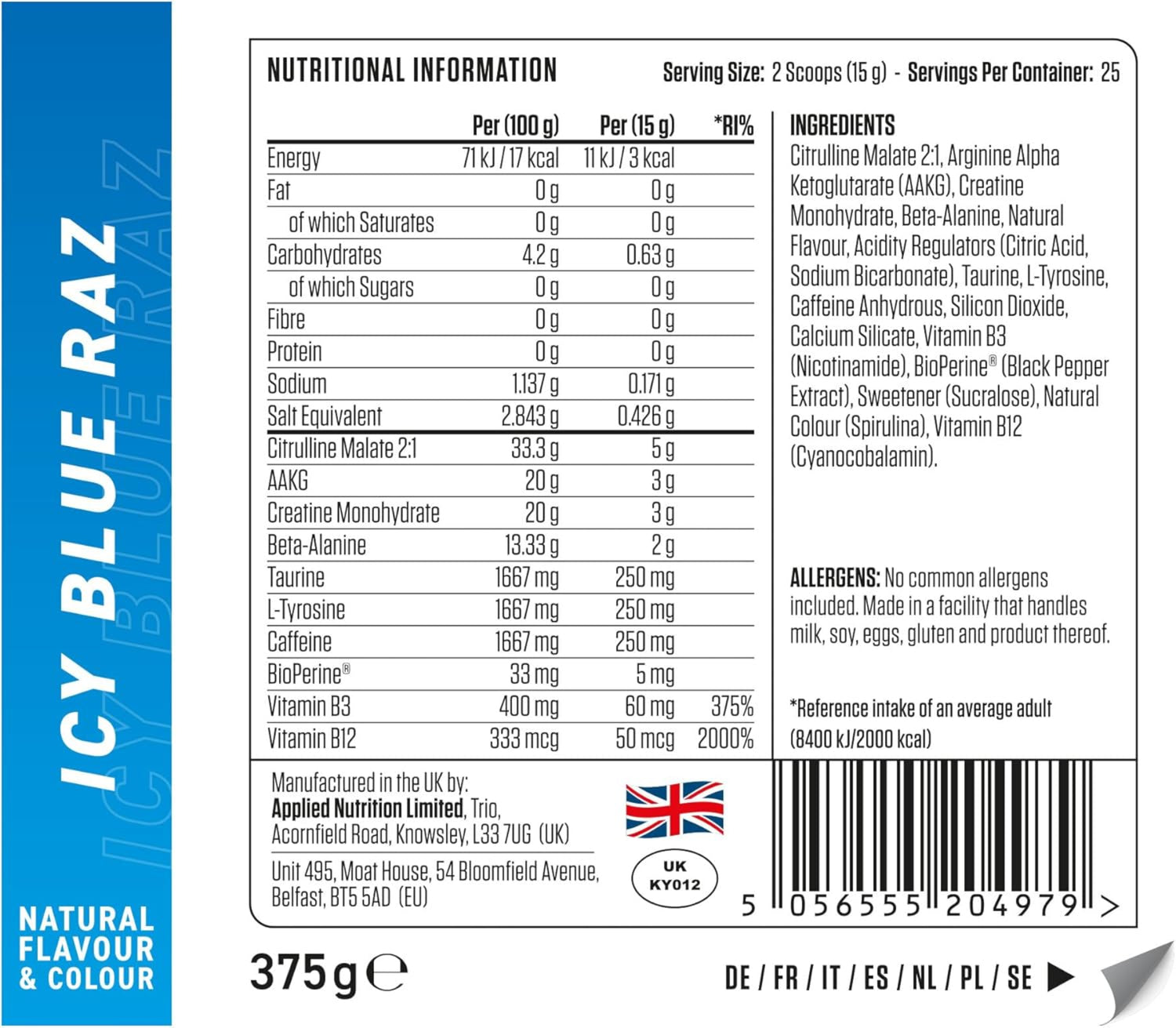 INGREDIENTS Citrulline Malate 2:1, Arginine Alpha Ketoglutarate (AAKG), Creatine Monohydrate, Beta-Alanine, Natural Flavor, Acidity Regulators (Citric Acid, Sodium Bicarbonate), Taurine, L-Tyrosine, Caffeine Anhydrous, Silicon Dioxide, Calcium Silicate, Vitamin B3 (Nicotinamide), BioPerine® (Black Pepper Extract), Sweetener (Sucralose), Natural Color (Beetroot Red), Vitamin B12 (Cyanocobalamin).